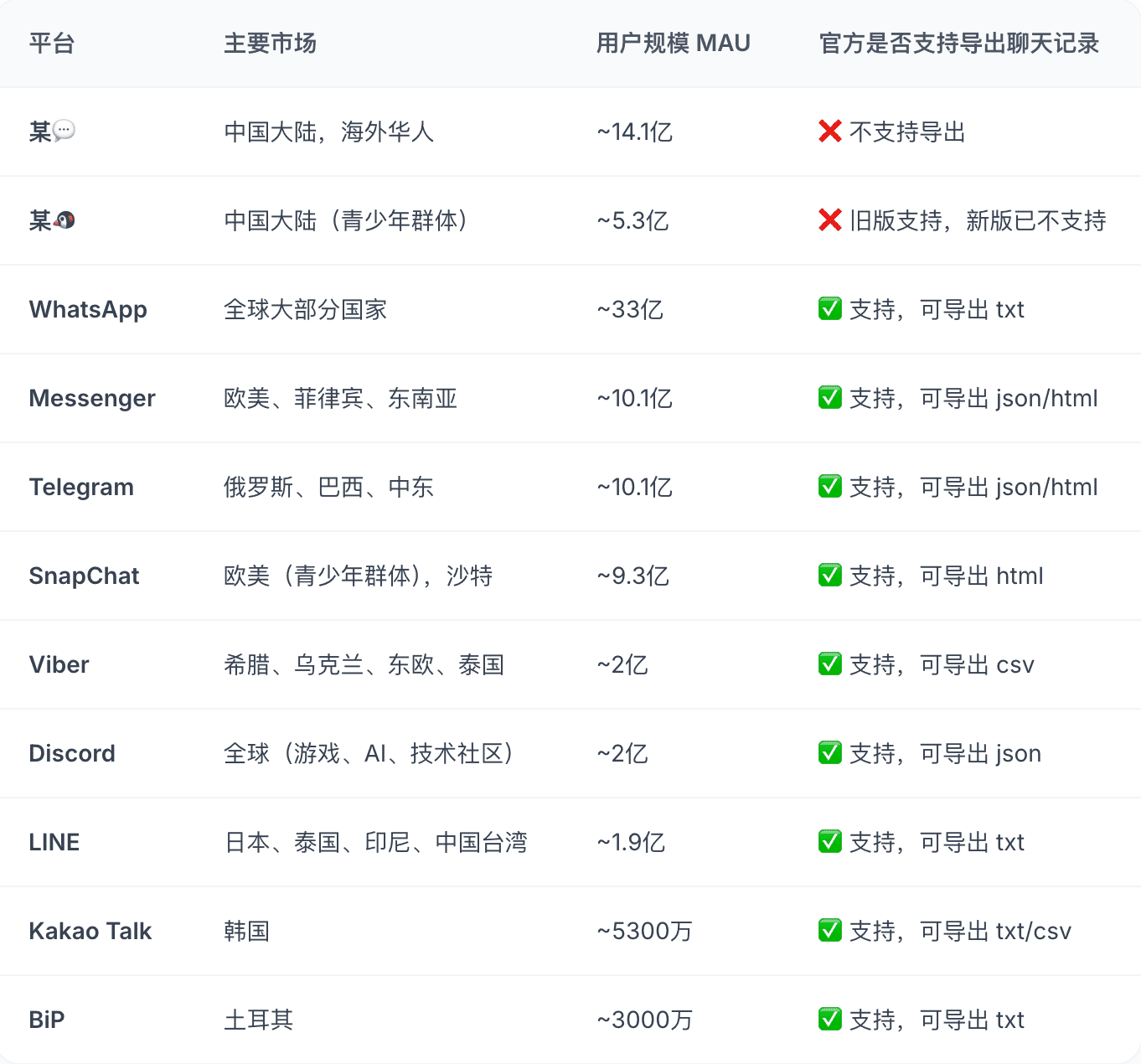 为了找到答案,我花了一天时间,调查了全世界主流聊天软件对“数据导出”的态度: